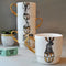 Gorgeous fine bone china stacking mugs set by Maid In China with hand painted gold handles and decal illustrations. Each mug holds 350 ml, and is dishwasher but not microwave safe.